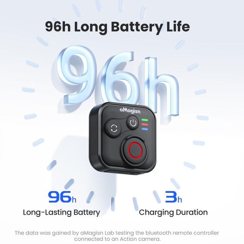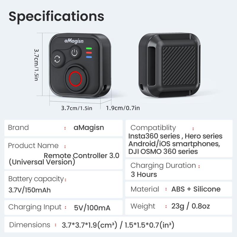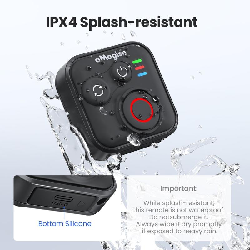 Controle sus tomas sin tocar la cámara con el mando a distancia Bluetooth AMAGISN. Diseñado para cámaras de acción y teléfonos inteligentes, este compacto controlador le permite iniciar la grabación o tomar fotos con solo pulsar un botón, lo que lo hace ideal para deportes, viajes, vlogs y fotos de grupo. Su estructura de silicona y ABS ofrece un agarre cómodo y antideslizante, mientras que la conexión inalámbrica proporciona un rendimiento estable para las tomas diarias.