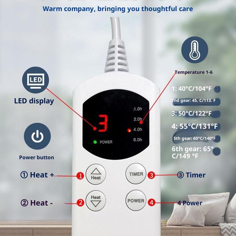 Personaliza tu comodidad con seis ajustes de temperatura que van de 40 °C a 65 °C (104 °F - 149 °F). El controlador LED intuitivo le permite elegir la intensidad perfecta para sus necesidades, mientras que los cuatro ajustes del temporizador de apagado automático (1 h, 2 h, 4 h, 6 h) garantizan la seguridad y la eficiencia energética durante un uso prolongado.