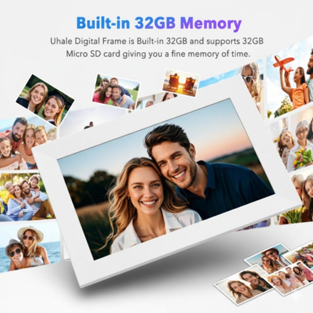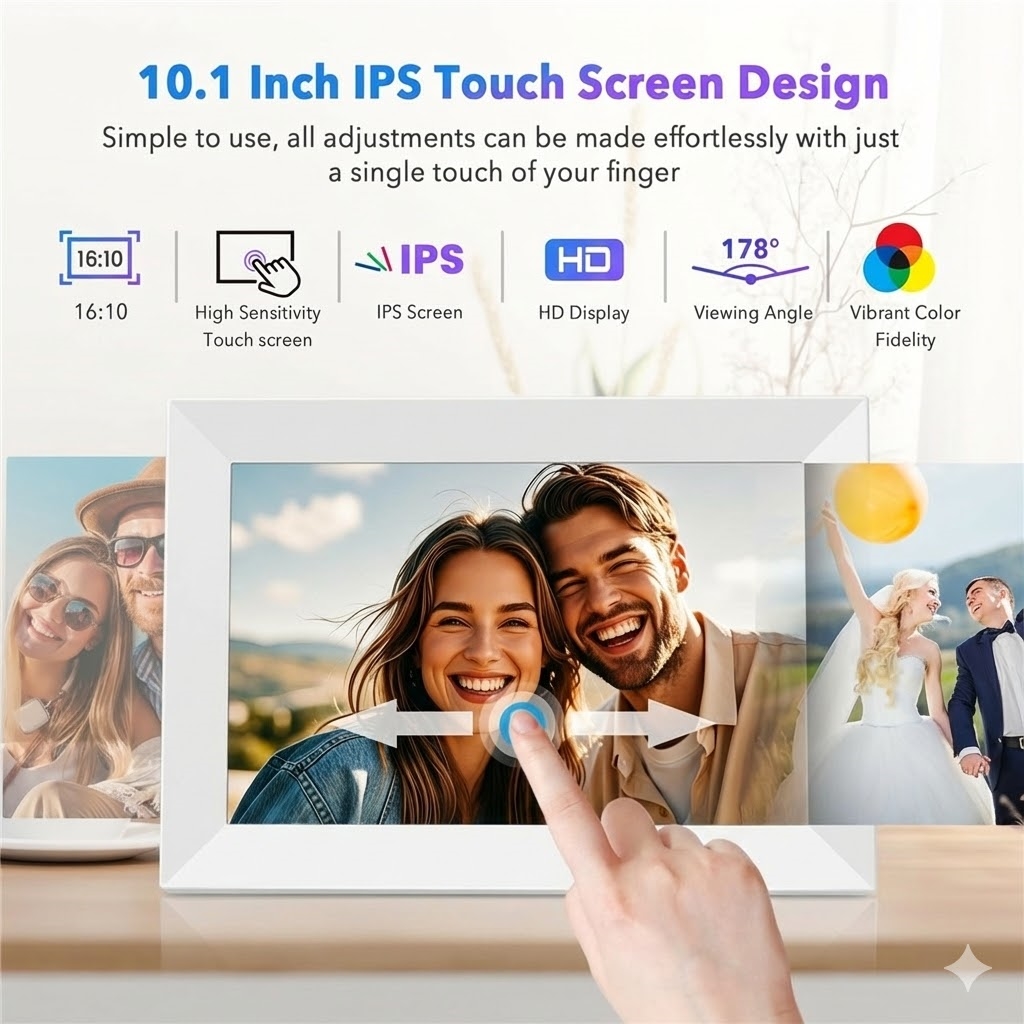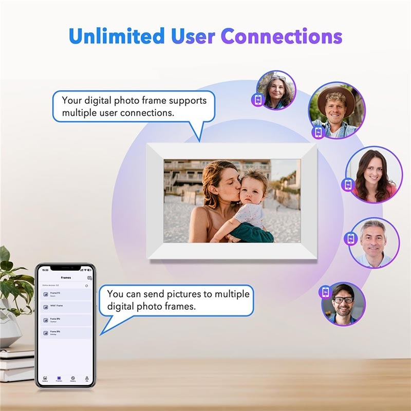 Este marco de fotos digital WiFi de 10.1" ofrece una calidad de visualización nítida, uso compartido inalámbrico inteligente, almacenamiento generoso y conectividad multiusuario, lo que lo convierte en la solución moderna perfecta para familias, oficinas o como regalo considerado.