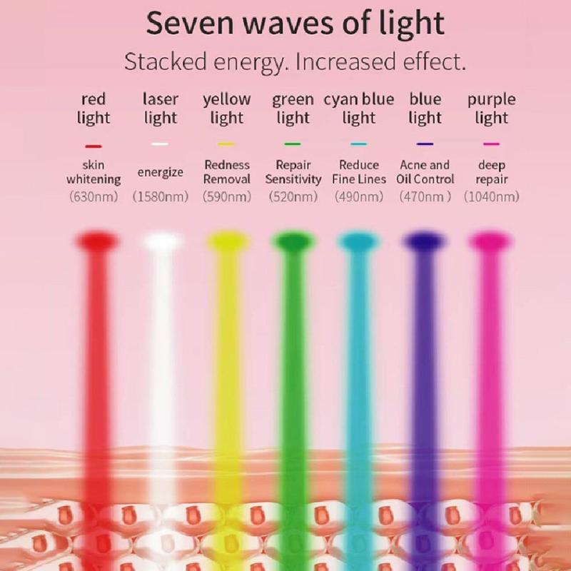 - Terapia LED de 7 colores - Incluye luz roja (630nm), azul (460nm), verde (515nm), púrpura, amarillo-naranja, cian y blanca para tratar múltiples problemas de la piel.
