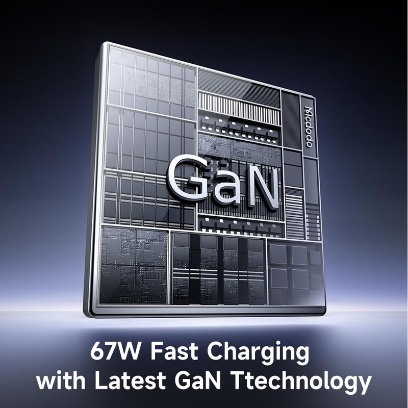 - La arquitectura GaN proporciona hasta 67W a la vez que funciona a menor temperatura y es más pequeña que los ladrillos de silicio tradicionales.
