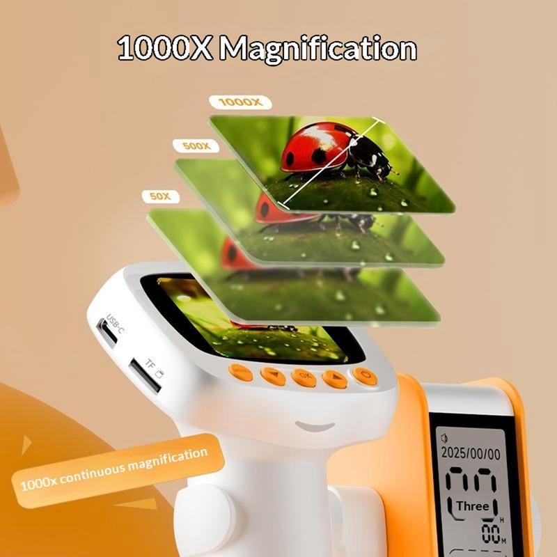 - Potente aumento de 1000x para examinar texturas finas y especímenes microscópicos