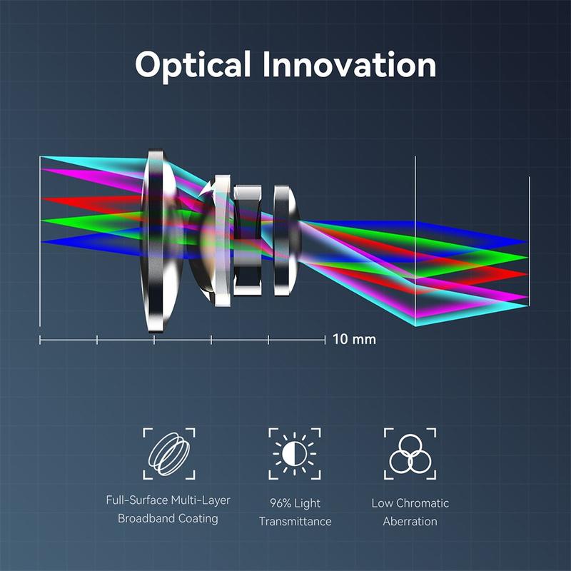 - Ingeniería óptica avanzada: revestimiento óptico multicapa de banda ancha con una transmitancia luminosa del 96% que minimiza la distorsión y la aberración cromática para obtener imágenes nítidas y de colores reales.