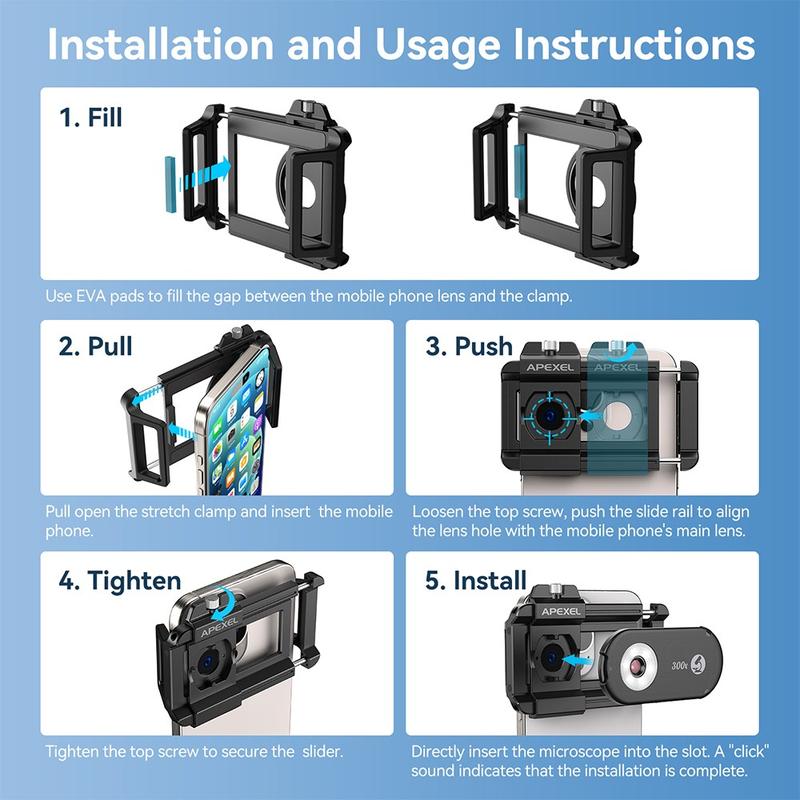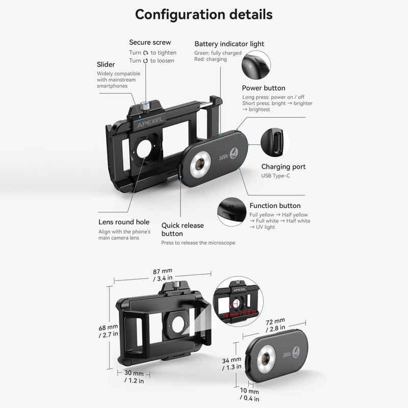 La lente de microscopio APEXEL APL-MS300 ofrece un aumento y una iluminación de nivel profesional en una herramienta de bolsillo. Su óptica de precisión, iluminación LED tricolor y detección UV lo convierten en un accesorio indispensable para la exploración, la investigación y la fotografía creativa.