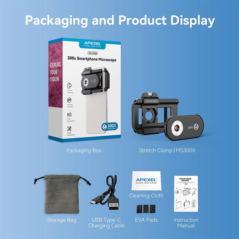 Convierta su smartphone en un potente microscopio portátil con el objetivo de microscopio acoplable APEXEL APL-MS300 300X. Diseñado con óptica de calidad profesional y sistemas de iluminación avanzados, este accesorio compacto lleva el aumento de nivel de laboratorio directamente a su teléfono, perfecto para entusiastas de la ciencia, educadores, joyeros y técnicos.