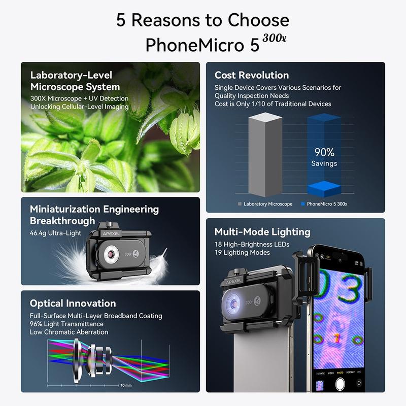 Apexel APL-MS300 300X Lente de Microscopio para Smartphone - Lupa con Clip con Iluminación LED Tri-Color y Detección UV