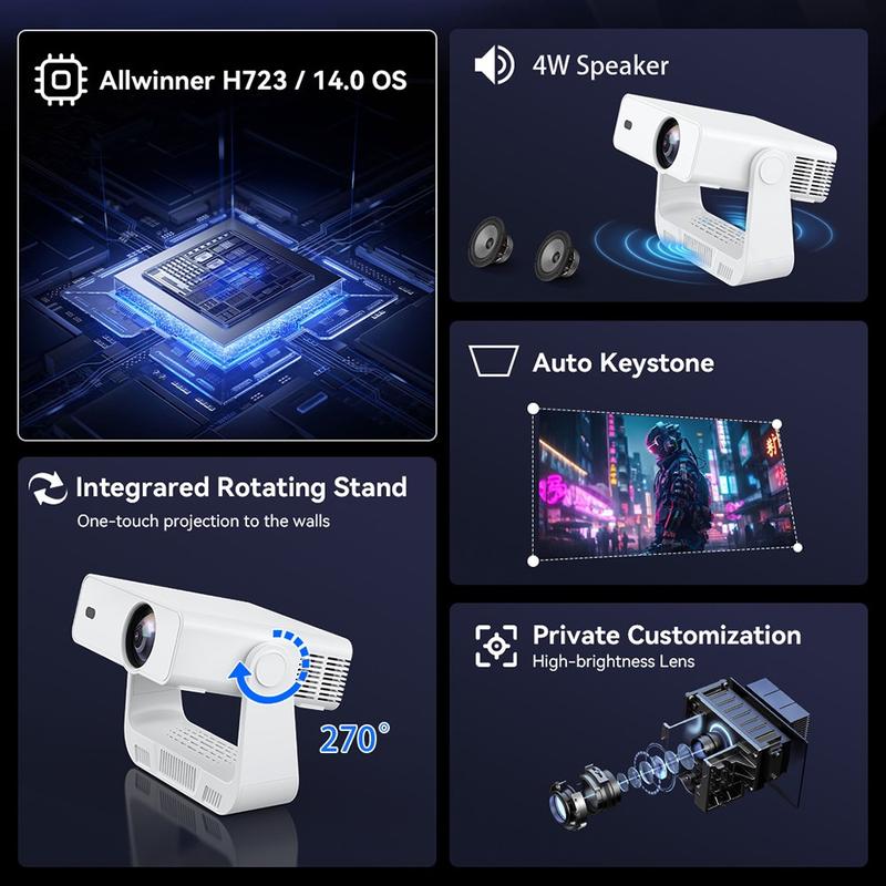 Con Android 14, un chipset Allwinner H723, 1 GB de RAM y 8 GB de ROM, el IMC880 admite la instalación de aplicaciones, la reproducción en streaming y la duplicación inalámbrica a través de Quickshare, incluyendo Miracast y AirPlay. También incluye entrada HD, USB 2.0 y una salida de audio de 3,5 mm, lo que facilita la conexión de dispositivos compatibles como ordenadores, consolas de videojuegos y teléfonos. Su formato compacto y su amplia compatibilidad lo convierten en un proyector práctico para el entretenimiento portátil y las necesidades generales de visualización.