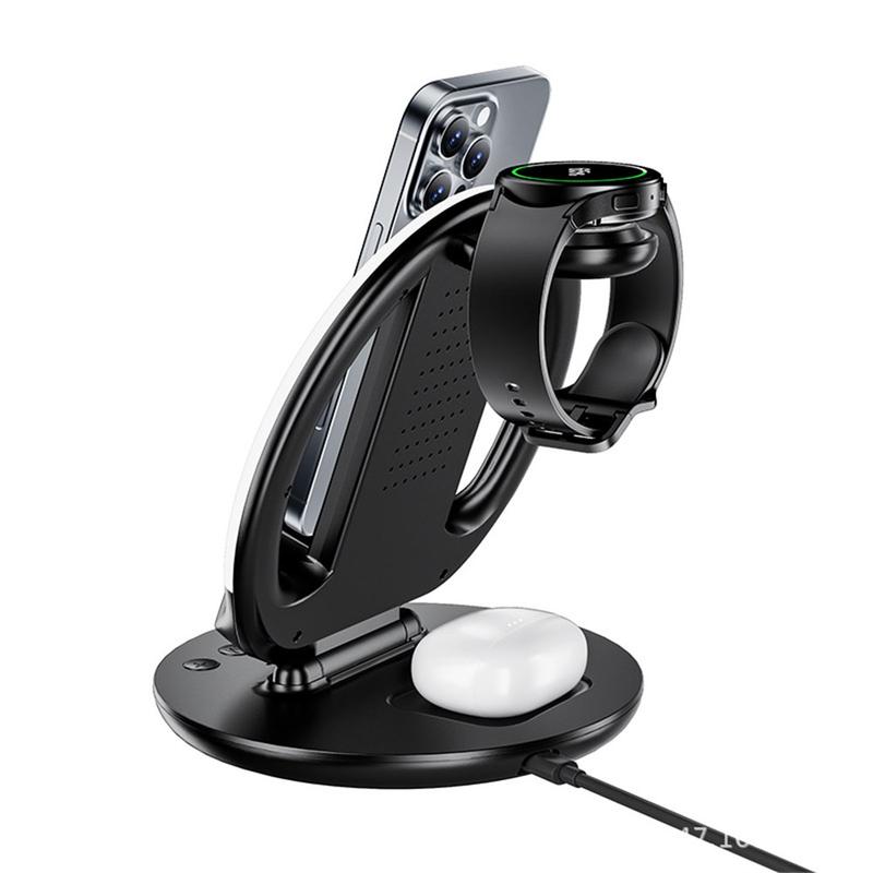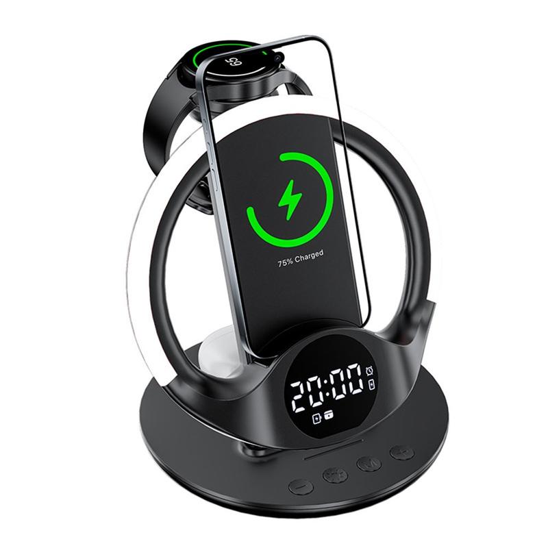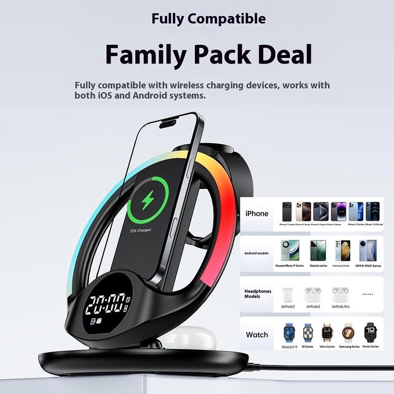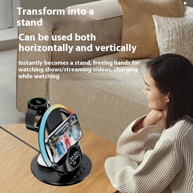 Cargue todos sus dispositivos esenciales con la estación de carga inalámbrica 6 en 1 N01, lo último en centros de carga todo en uno para smartphones, smartwatches y auriculares. Diseñada para usuarios de Apple y Samsung, combina funcionalidad, estilo y seguridad en una estación compacta, perfecta para escritorios, mesillas de noche u oficinas.