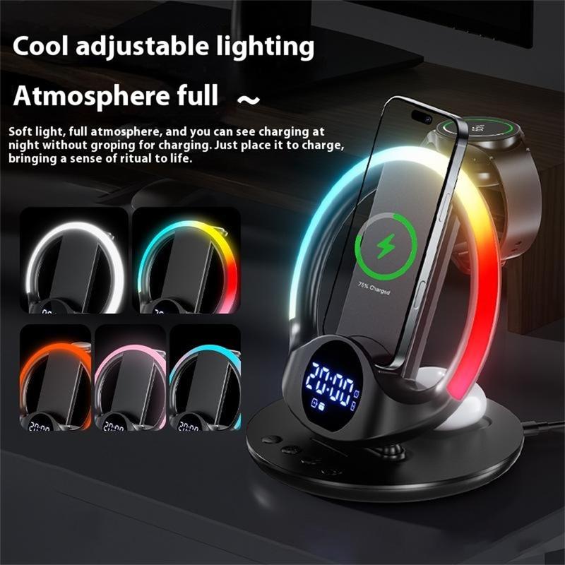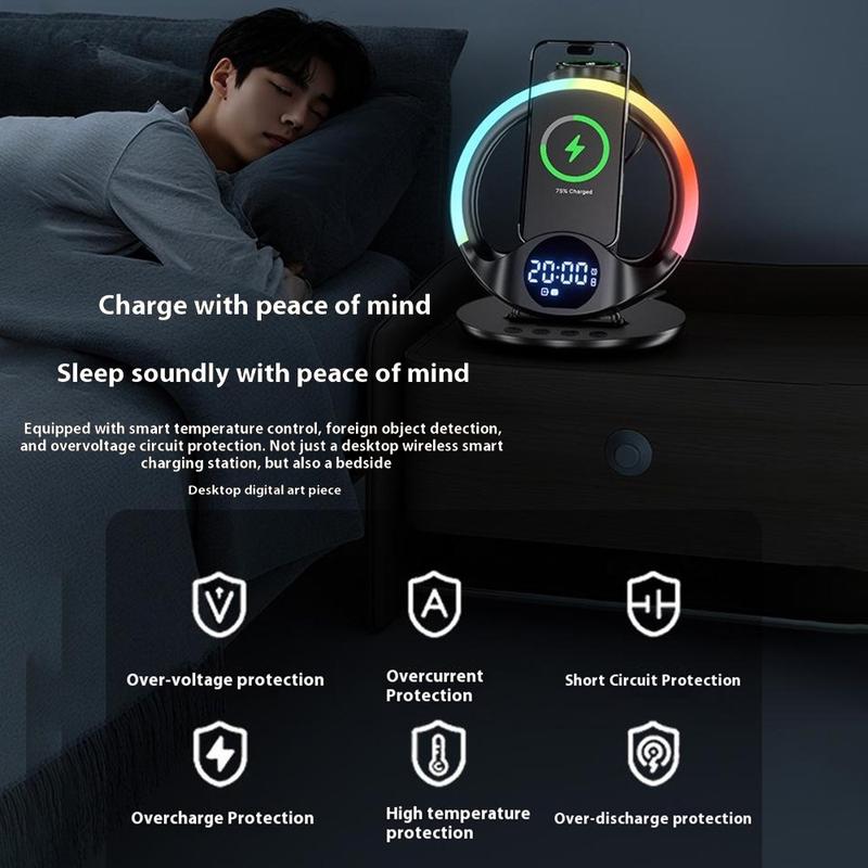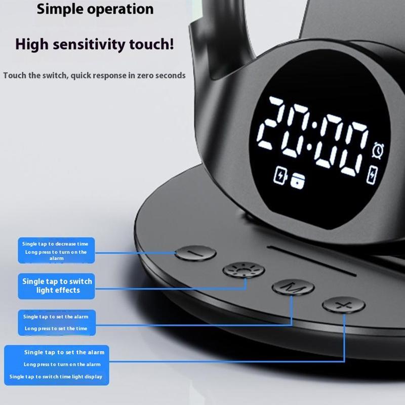 Más que un cargador: también funciona como reloj digital y soporte para el teléfono. Elija entre cinco modos de retroiluminación LED ambiental (blanco, blanco rosado, rojo, azul hielo, color fantasía) para que coincida con su estado de ánimo o decoración.