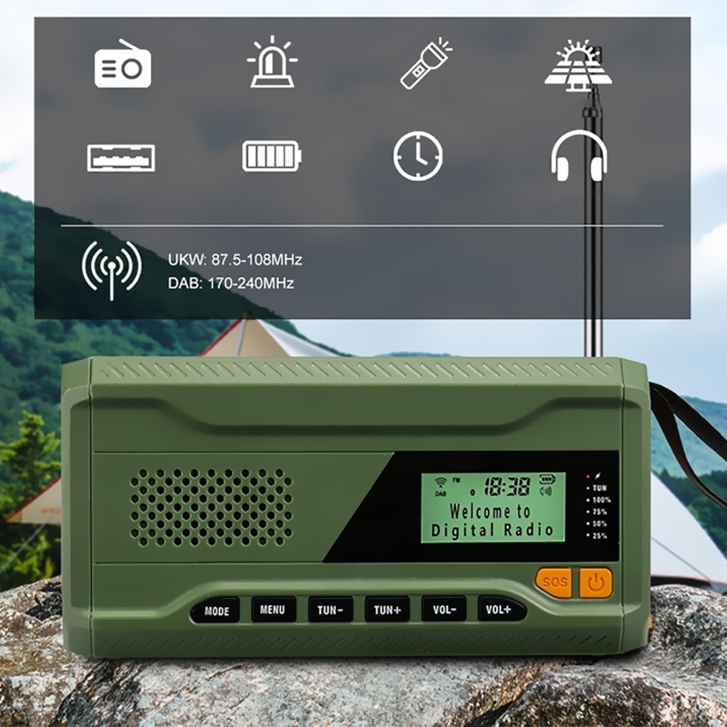 • Portable Solar Hand Crank Emergency Radio with LED Flashlight and Power Bank WR-6D - DAB/FM, 4500mAh
