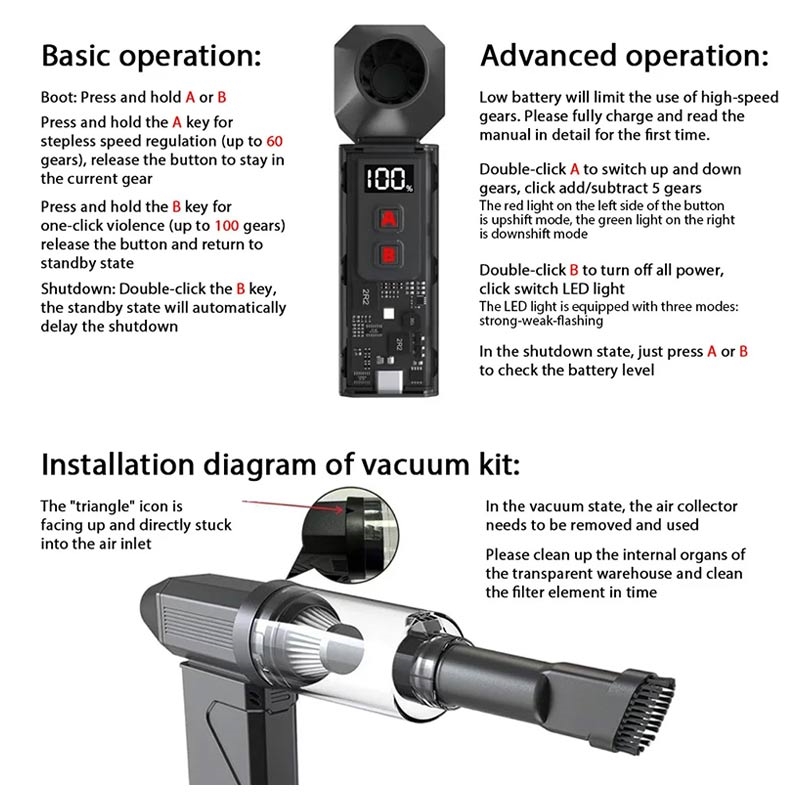 • Potente aspiradora y soplador turbo 2 en 1: 13.000 rpm, 100 niveles de velocidad, batería de 8000 mAh.