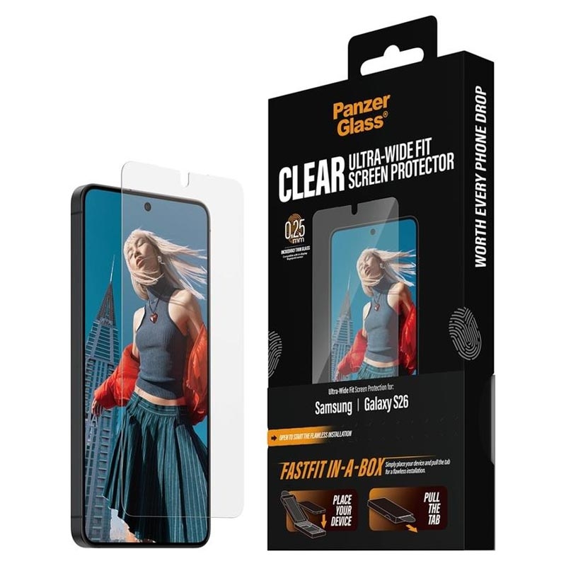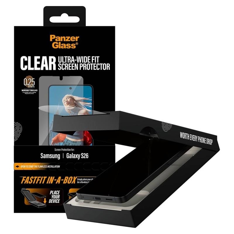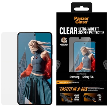 • Protector de pantalla de cristal templado PanzerGlass Ultra-Wide Fit con FastFit In-A-Box para Samsung Galaxy S26
