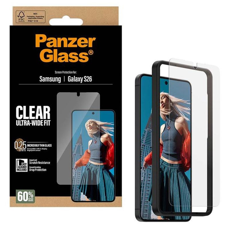 - Protector de pantalla de vidrio templado Ultra-Wide Fit para Samsung Galaxy S26 de PanzerGlass