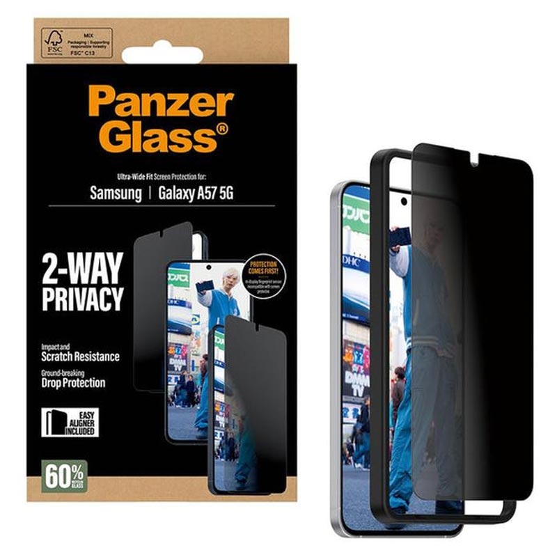 - El protector de pantalla PanzerGlass Ultra-Wide Fit Privacy EasyAligner NO es compatible con el sensor de huellas dactilares del Samsung Galaxy A57