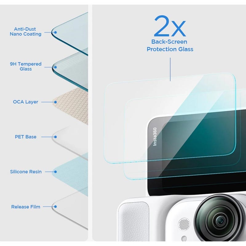 El vidrio templado de 0.3mm de espesor cuenta con la dureza estándar de la industria 9H, por lo que es resistente a los arañazos por llaves, monedas y otros artículos en su bolso o bolsillos. Sobre eso, las superficies oleophóbicas y los bordes 2.5D suaves aseguran un fácil mantenimiento y la comodidad al mantener su Insta360 Go Ultra.