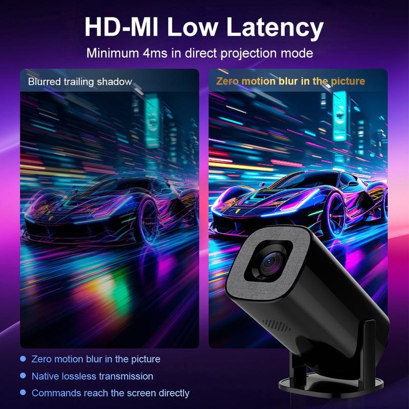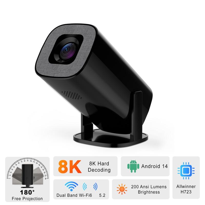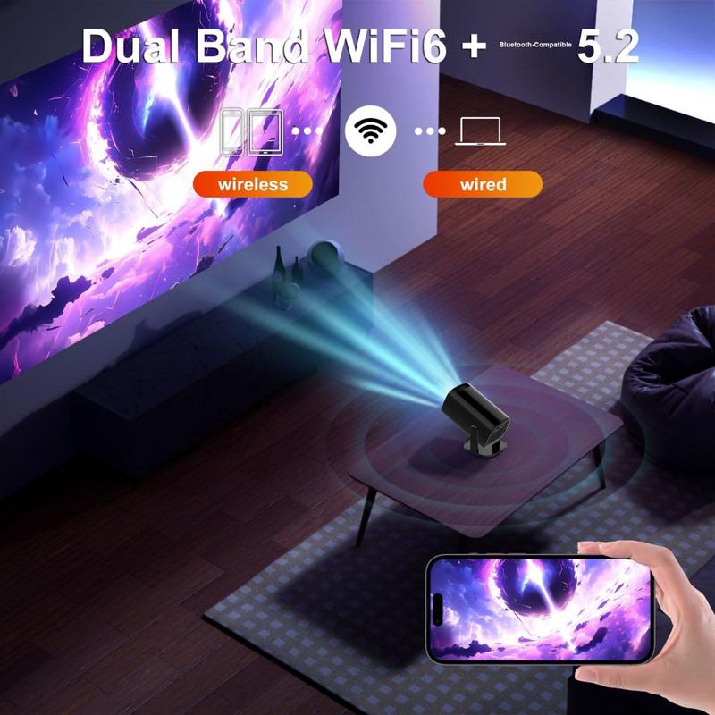 Proyector portátil V1 Android 14 (200 ANSI) - 720p nativo, corrección trapezoidal automática, inclinación de 180°, WiFi 6 de doble banda y Bluetooth 5.2, 1 GB/8 GB
