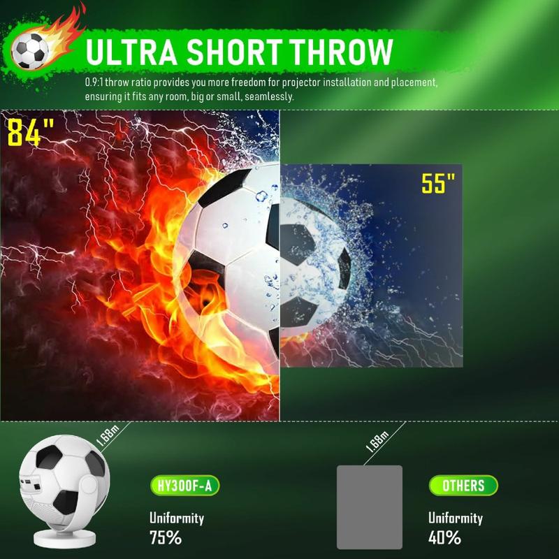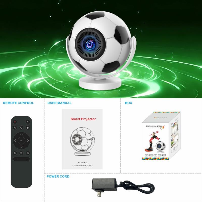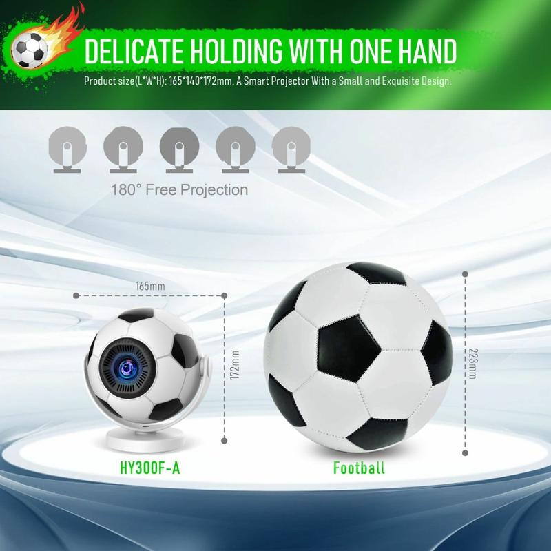 Proyector portátil HY300F con diseño de balón de fútbol: WiFi 6, Android 14, 170 lúmenes ANSI, proyector de cine en casa de 720p, con enchufe de la UE