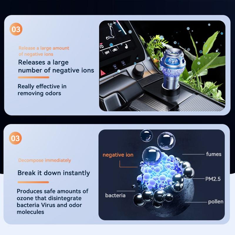 Renueva el ambiente de tu vehículo con el purificador e ionizador de aire para coche Q1, una solución compacta diseñada para ayudar a reducir los olores desagradables y crear una atmósfera más limpia en el habitáculo. Con una elegante carcasa de metal y aleación de aluminio, un funcionamiento silencioso y una sofisticada iluminación ambiental azul, este dispositivo para el coche combina la practicidad del uso diario con un diseño moderno que se integra perfectamente en el interior.