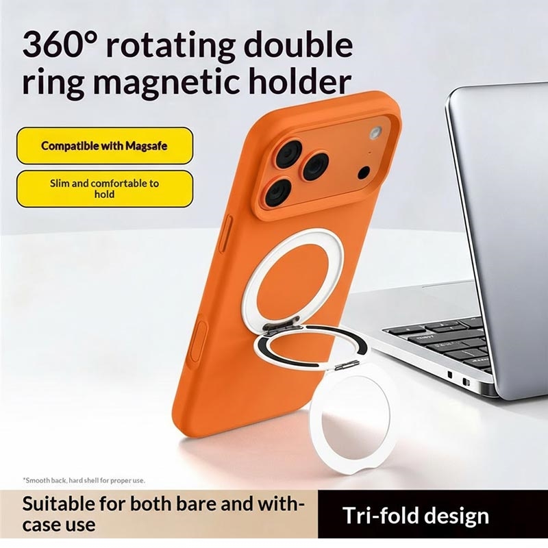 El soporte de anillo magnético tríptico ultrafino Q11 es un elegante agarre y soporte de teléfono diseñado para un uso diario flexible sin añadir volumen. Con una estructura de triple pliegue, se pliega de forma compacta cuando no está en uso, mientras que la rotación de 360° le permite ajustar rápidamente entre la visualización vertical y horizontal. El soporte adhesivo hace que la instalación sea rápida y segura, y el imán incorporado añade compatibilidad con soportes y accesorios magnéticos.