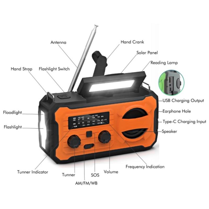 - Herramienta de supervivencia multifunción: radio, linterna, luz de lectura, cargador solar y batería externa