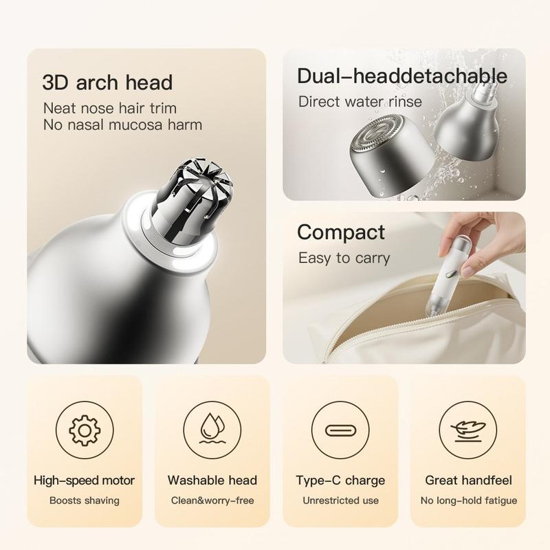 Mantén tu aseo diario sencillo y preciso con esta recortadora eléctrica de vello nasal y facial para hombre. Diseñada en un formato compacto que cabe en la palma de la mano, esta herramienta de aseo portátil combina funciones de recorte de vello nasal y retoques faciales en un solo dispositivo, lo que la convierte en una opción práctica para usar en casa, en el trabajo, en la bolsa del gimnasio y en los viajes. Su pequeño tamaño facilita su almacenamiento y transporte, mientras que el diseño inalámbrico recargable aporta comodidad en el día a día.