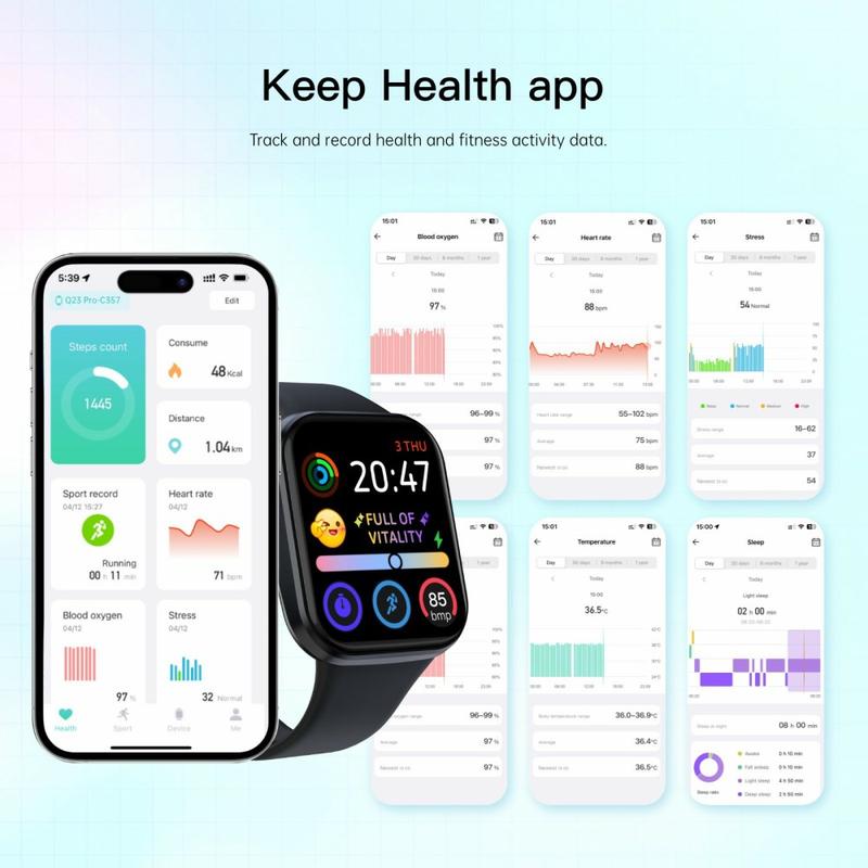 El reloj inteligente Q23Pro ofrece una gran pantalla a color de 1.83 pulgadas, un rendimiento fluido y un seguimiento fiable de la salud y el estado físico para el uso diario. Diseñado con una carcasa integrada delgada y cristal curvado en 3D, es compatible con llamadas Bluetooth, control de música y más de 100 esferas de reloj personalizables. Con una batería de larga duración, un seguimiento completo de la salud y una amplia compatibilidad con Android e iOS, es un reloj inteligente práctico para mantenerse conectado y activo.