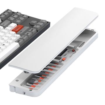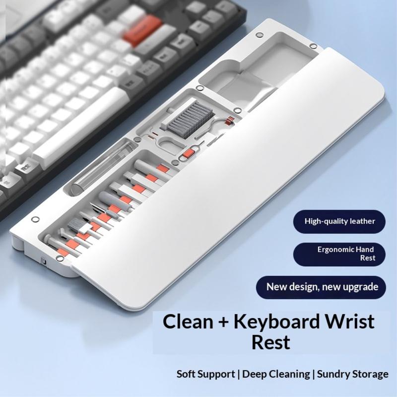 Dentro del reposamuñecas hay un completo kit de limpieza de 22 herramientas diseñado para limpiar en profundidad teclados, auriculares, puertos de carga de teléfonos, lentes de cámaras, interruptores y otros dispositivos electrónicos. Cada herramienta tiene su propio lugar, lo que garantiza una fácil organización y un acceso rápido.