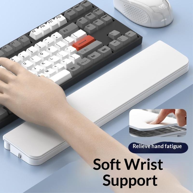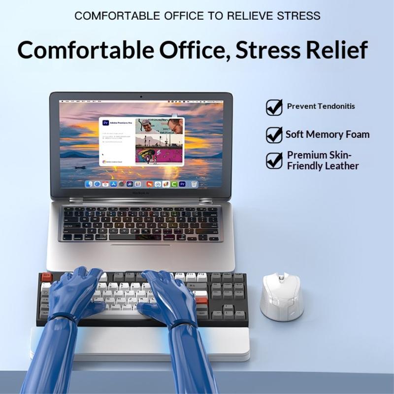 El reposamuñecas está fabricado con poliuretano suave y acolchado de espuma de alta calidad para proporcionar un apoyo suave y estable a la muñeca. Su diseño ergonómico ayuda a reducir la presión y la fatiga durante sesiones prolongadas de mecanografía, trabajo de oficina o estudio.