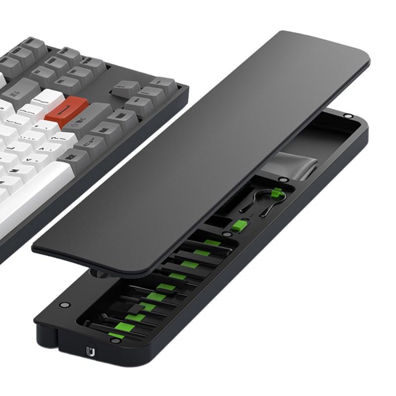 Dentro del reposamuñecas hay un completo kit de limpieza de 22 herramientas diseñado para limpiar en profundidad teclados, auriculares, puertos de carga de teléfonos, lentes de cámaras, interruptores y otros dispositivos electrónicos. Cada herramienta tiene su propio lugar, lo que garantiza una fácil organización y un acceso rápido.