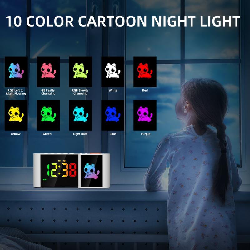 Reloj despertador para niños con pantalla doble, 12/24 horas, luz nocturna y dibujos animados RGB en forma de S