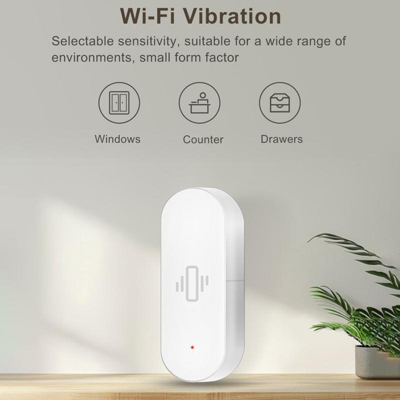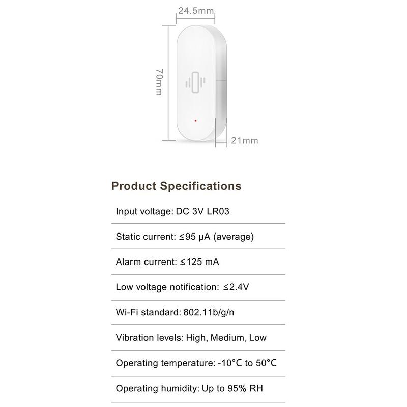 Este sensor requiere una conexión WiFi estable de 2,4 GHz y una pila AAA (no incluida). Para obtener los mejores resultados, fíjelo firmemente a la superficie que desea supervisar y pruebe los ajustes de sensibilidad para evitar falsas alarmas.