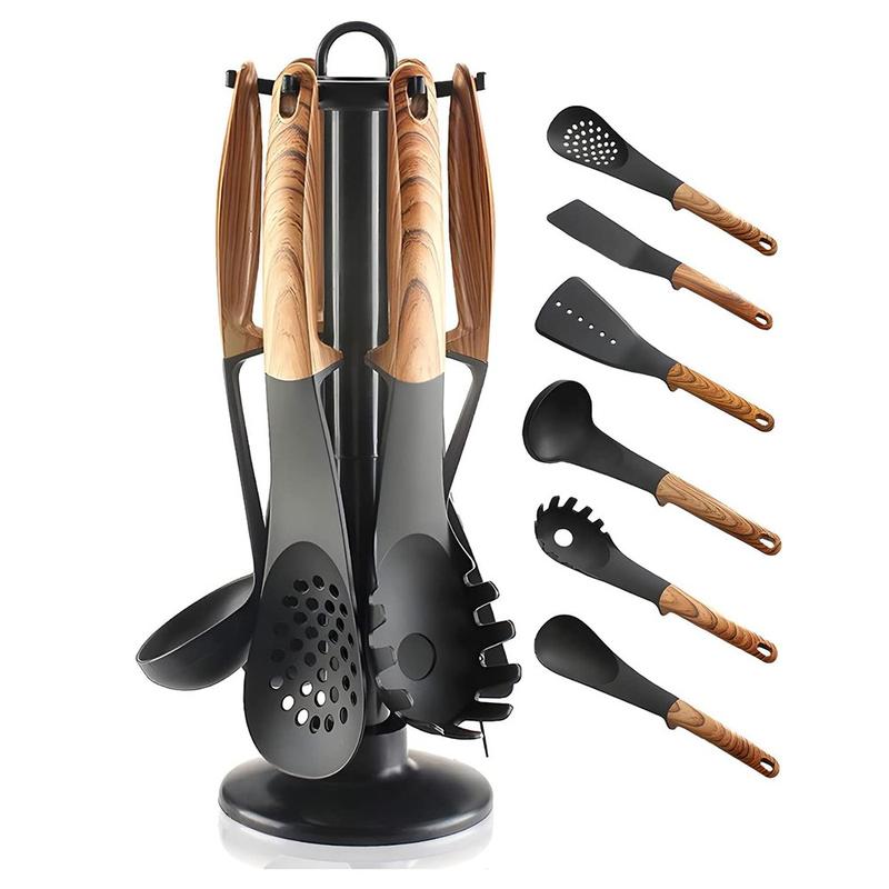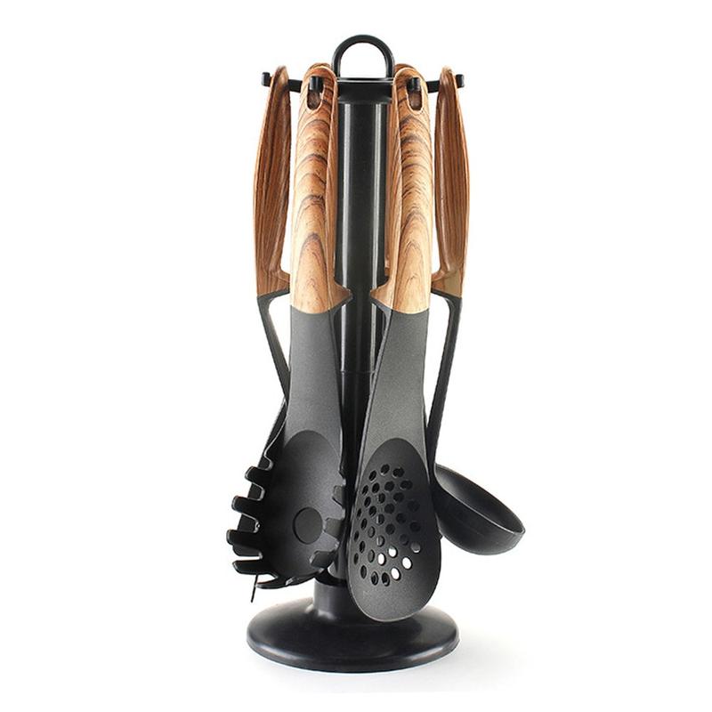 Actualice sus utensilios de cocina con esta colección de 7 utensilios resistentes al calor, diseñados para el uso diario y para cocinar sin esfuerzo. Con cabezales de nailon resistentes, mangos ergonómicos con textura de madera y una práctica rejilla de almacenamiento, este set ofrece estilo, comodidad y practicidad para cualquier cocina.