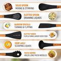 - Colección de cocina completa de 7 piezas - Incluye todos los utensilios esenciales de cocina: cucharón sopero, cuchara ranurada, cuchara sólida, espátula ranurada, espátula sólida, servidor de pasta y un soporte de almacenamiento a juego.