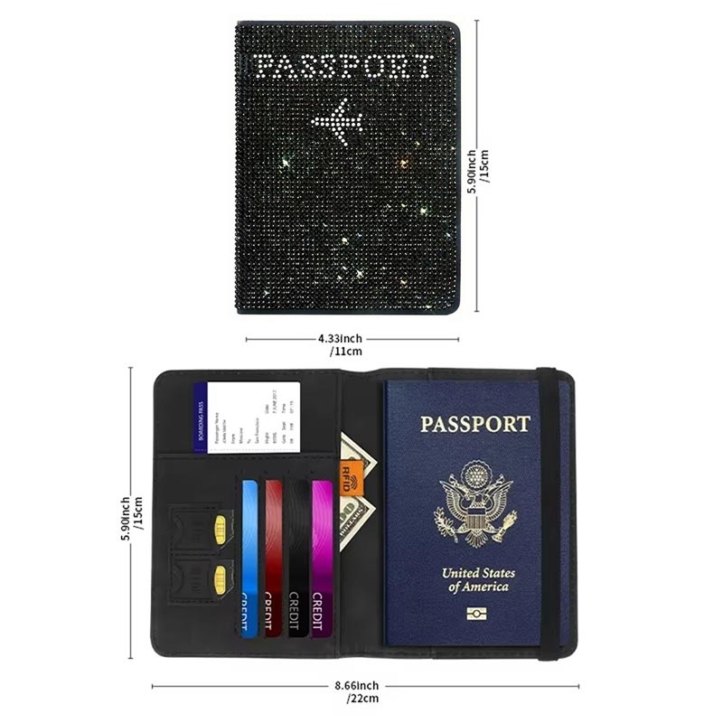 Viaja con estilo con el set de portapasaportes y etiqueta de equipaje de strass, un glamuroso dúo de accesorios diseñado para ofrecer elegancia y practicidad. Fabricado en poliuretano resistente y adornado con deslumbrantes diamantes de imitación, este set a juego aporta lujo y brillo a cada viaje.