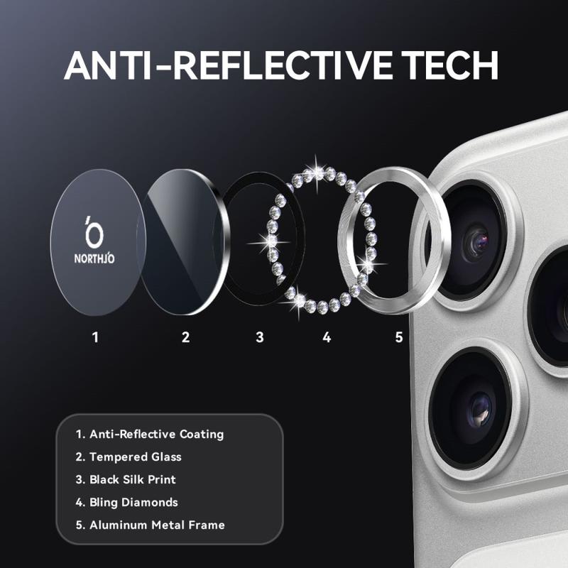 • Set protector de lente de cámara de vidrio templado con diamantes de imitación Northjo para iPhone 17 Pro, iPhone 17 Pro Max