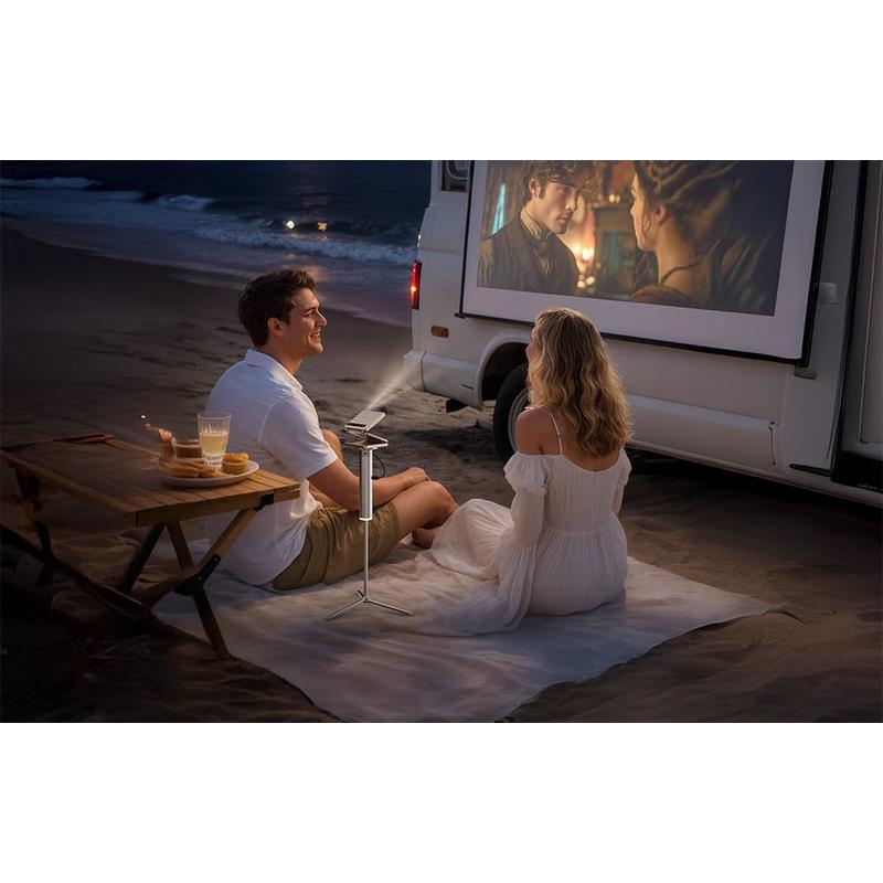 - Noche de cine al aire libre: coloque el soporte en el suelo, ajuste la altura a 33 cm o 43 cm y encienda el proyector con la batería incorporada