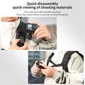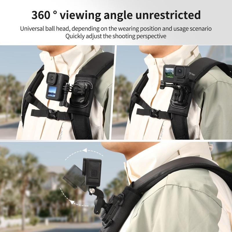 El soporte también cuenta con una rótula universal para un ajuste flexible del ángulo, lo que facilita la colocación de la cámara para grabaciones en primera persona o tomas desde un ángulo lateral, dependiendo de cómo lleves la mochila. Con su diseño ligero, su construcción duradera de nailon y fibra, y su función de liberación rápida, es un accesorio práctico para creadores y usuarios al aire libre que desean grabar con mayor facilidad mientras se desplazan.