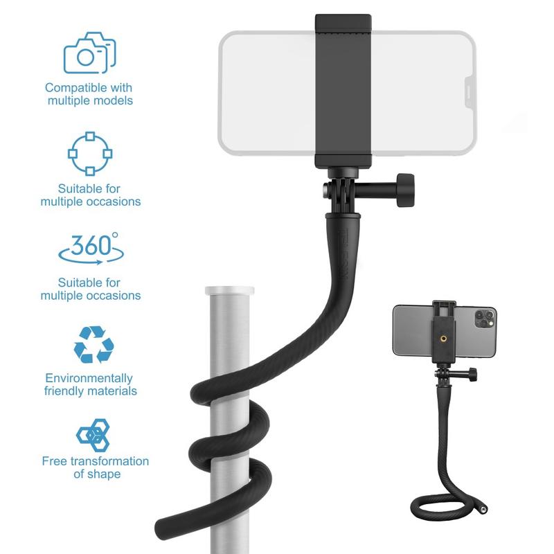 El Telesin TE-FM-003 presenta un diseño flexible y envolvente con una tira de aluminio flexible incorporada, lo que le permite fijarlo a postes, barandillas, manillares, ramas u otros objetos para obtener ángulos de disparo creativos.