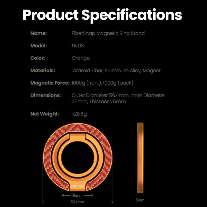 El Nillkin FiberSnap Magnetic Ring Stand combina materiales de primera calidad con una funcionalidad flexible para mejorar el uso diario del teléfono. Fabricado con fibra de aramida ligera y aluminio anodizado, ofrece una estética tecnológica refinada a la vez que proporciona un agarre seguro y una visualización manos libres sin esfuerzo. Diseñado para un uso MagSafe perfecto, se adapta sin problemas al trabajo, los viajes y la vida diaria sin estorbar.