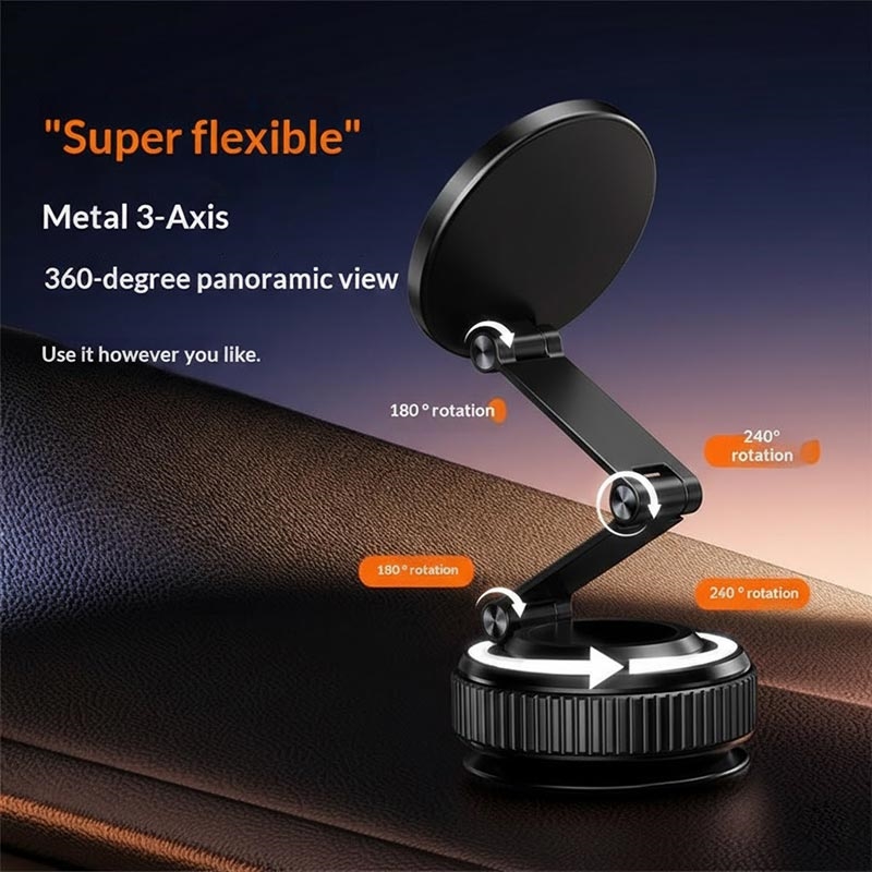 Fabricado con un brazo de aleación de aluminio plegable en tres partes, el soporte permite un ajuste flexible en varios ejes: rotación de la base de 360°, movimiento de la articulación central de 240° y ajuste de la placa superior de 180°. Esto permite un posicionamiento preciso para la navegación, las llamadas o la visualización de contenidos multimedia en cualquier ángulo.