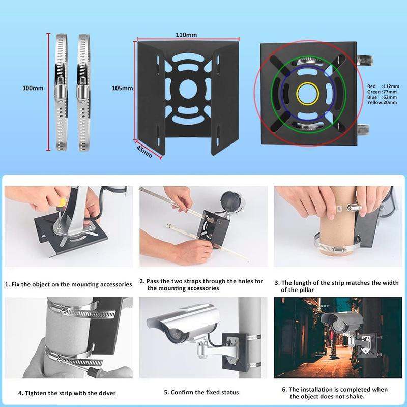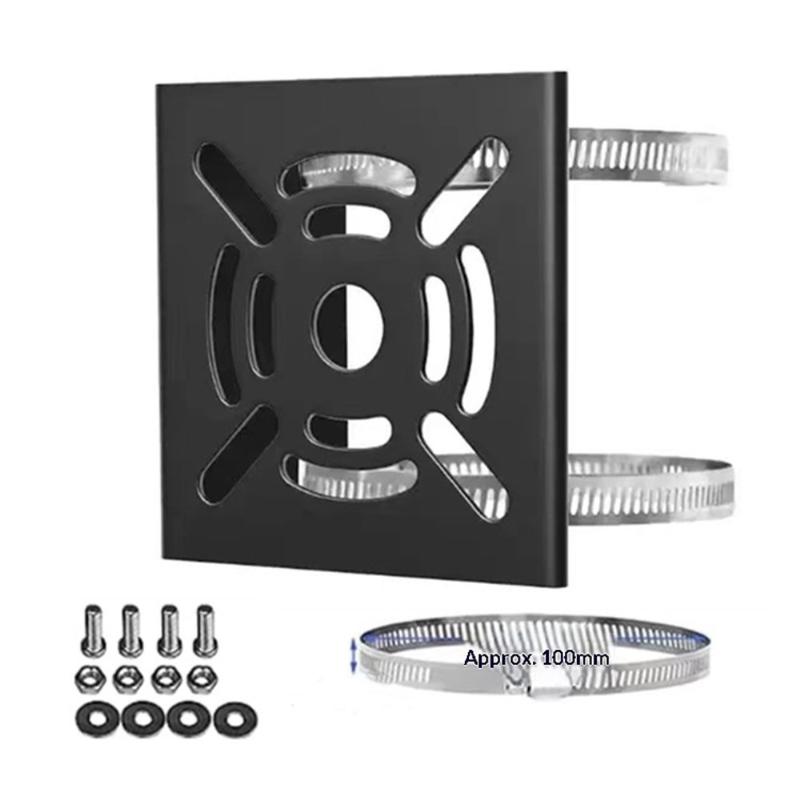 La abrazadera de poste para soporte de cámaras de seguridad está diseñada para proporcionar una solución de montaje segura y ajustable para cámaras de vigilancia en una amplia gama de entornos. Su instalación basada en abrazaderas permite una configuración rápida sin necesidad de taladrar, por lo que es ideal tanto para necesidades de vigilancia temporales como permanentes.