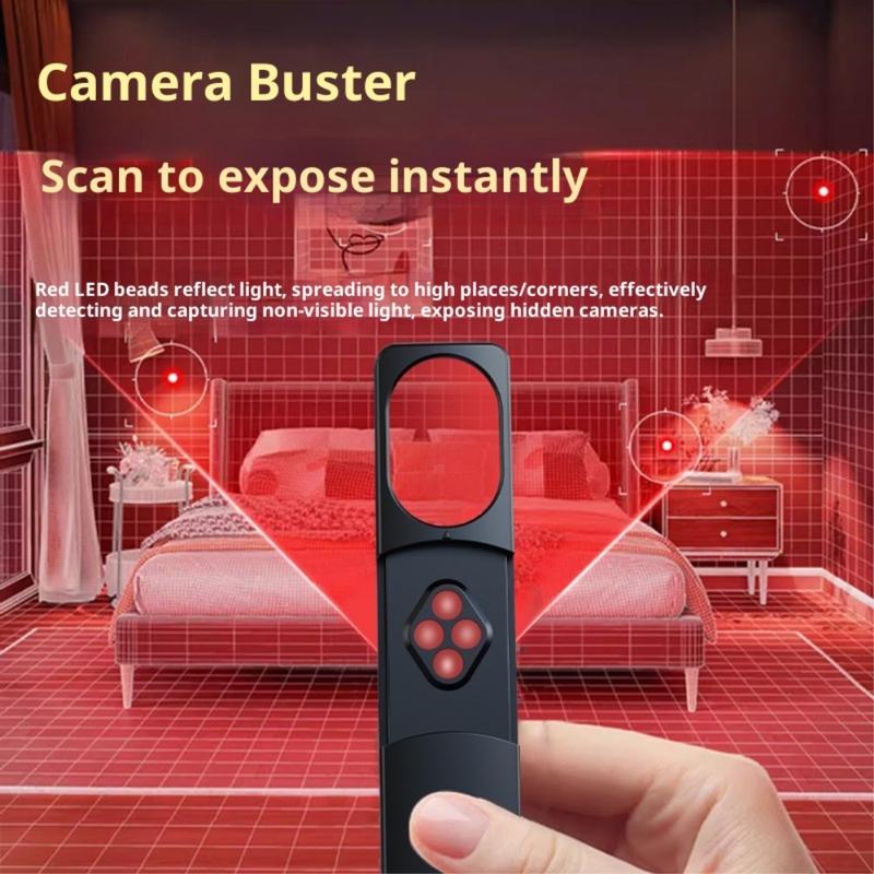 El escáner de infrarrojos LED incorporado deja al descubierto las lentes de las cámaras ocultas, incluso si están apagadas o en modo oculto: ideal para detectar cámaras estenopeicas en espejos, detectores de humo, salidas de aire, relojes y otros objetos.