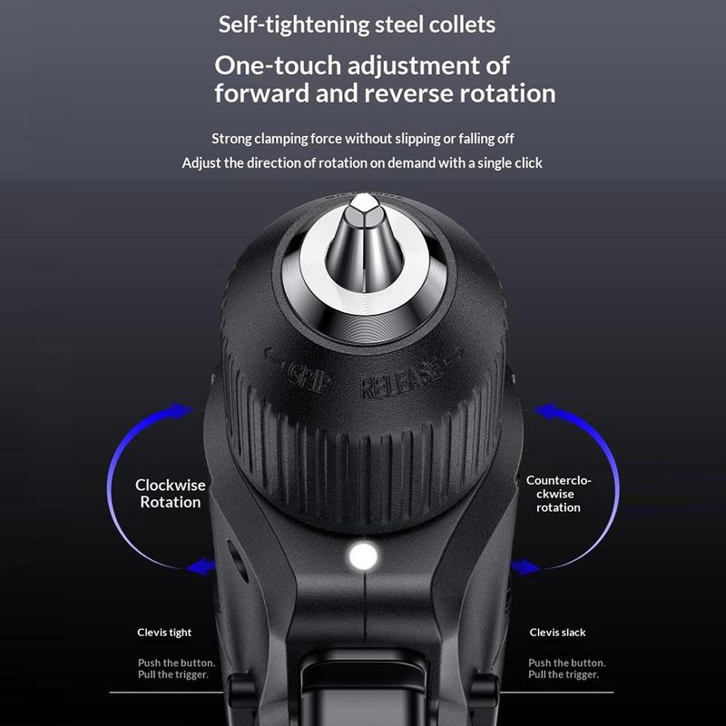 El destornillador cuenta con un sencillo control de un solo botón para la rotación en sentido horario y antihorario, lo que facilita el cambio entre apretar y aflojar tornillos. Esto mejora la eficiencia durante los trabajos de montaje, reparación y mantenimiento, especialmente al pasar rápidamente de una tarea a otra. La disposición intuitiva de los controles hace que la herramienta sea adecuada tanto para usuarios experimentados como para aquellos que buscan una herramienta práctica para el uso diario.