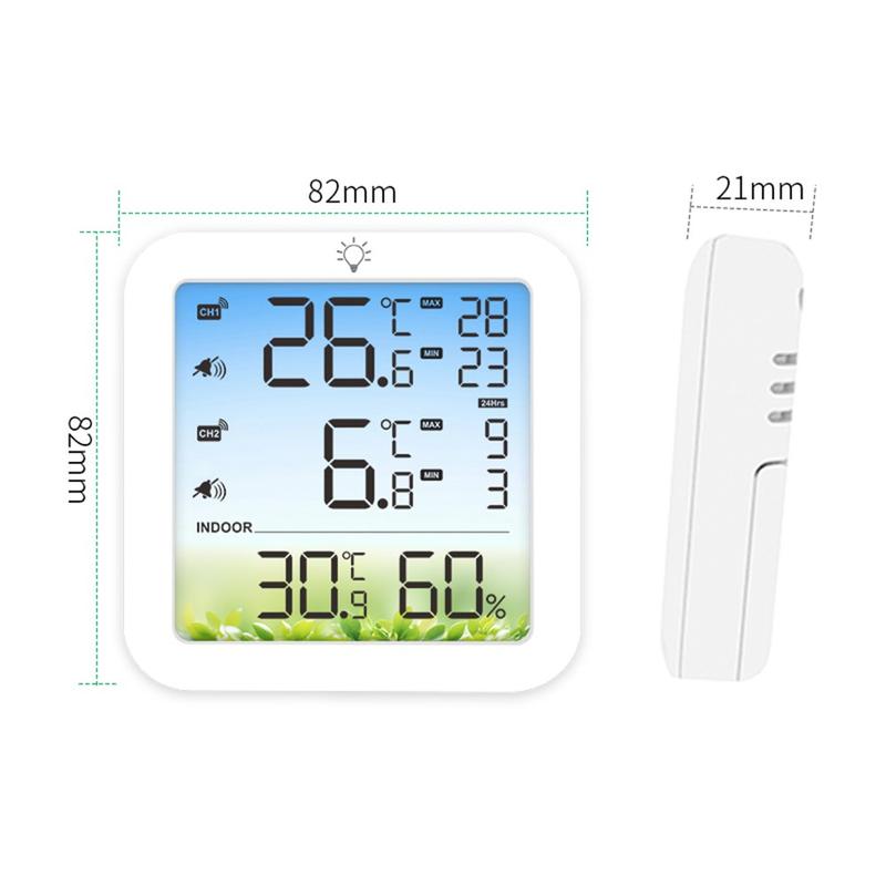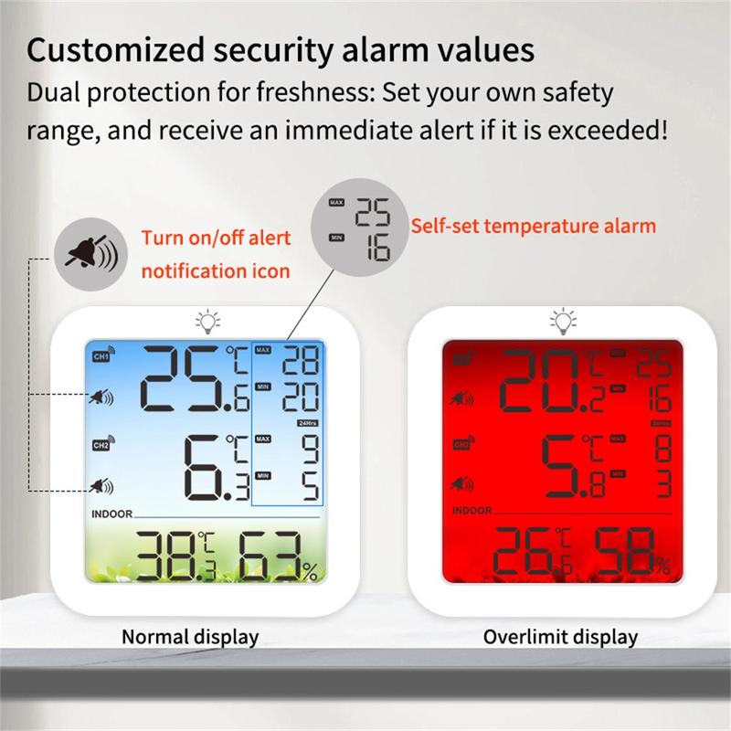 • Termómetro e higrómetro inalámbrico de doble canal TS-8082: monitor de temperatura para frigoríficos y congeladores con 2 sensores y alarma