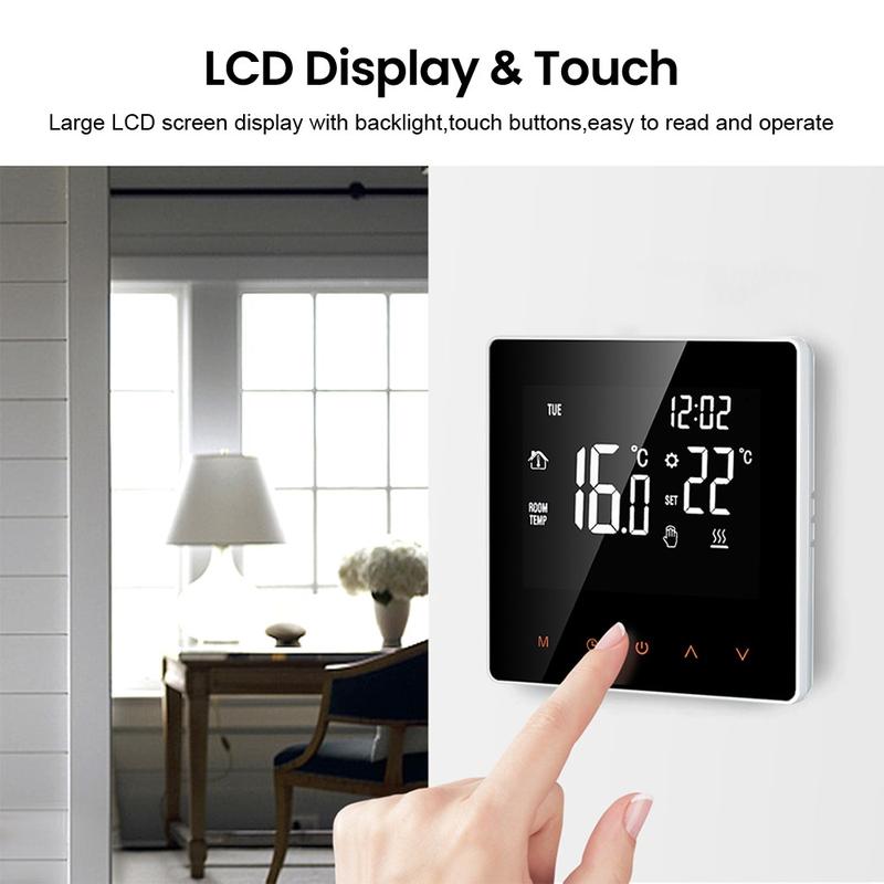 La gran pantalla táctil LCD con retroiluminación es fácil de leer tanto de día como de noche. Su elegante diseño de una sola pieza le da al termostato un aspecto limpio y moderno, mientras que la superficie antiarañazos ayuda a mantenerlo en buen estado con el paso del tiempo. Puedes elegir entre el modo manual para el ajuste directo y el modo automático para la calefacción programada, dependiendo de tu rutina diaria y tus preferencias personales.