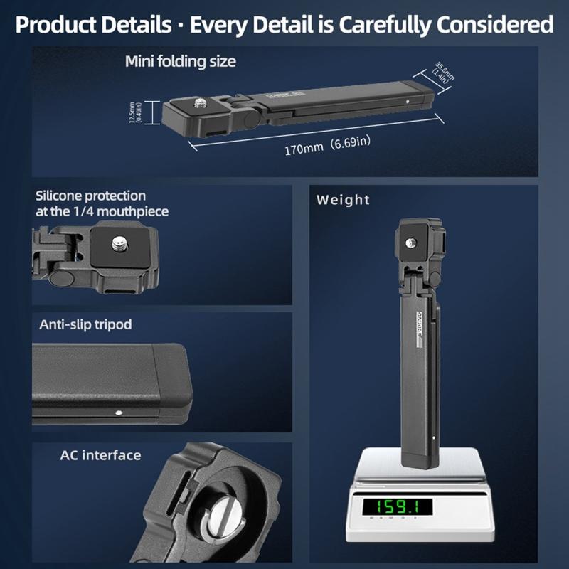 Fabricado con aleación de aluminio de grado aeroespacial, el trípode pesa solo 160 g y ofrece una excelente resistencia y resistencia a la corrosión. El acabado anodizado mejora la durabilidad para su uso en exteriores y en cualquier condición climática.