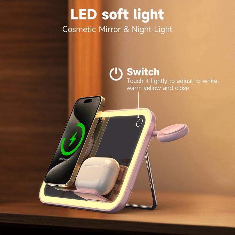 El cargador inalámbrico 3 en 1 V22 es perfecto para cualquiera que busque combinar múltiples funcionalidades en un único y elegante dispositivo. Ofrece la comodidad de la carga inalámbrica, un brillante espejo de maquillaje LED y una luz nocturna, todo en una unidad compacta.