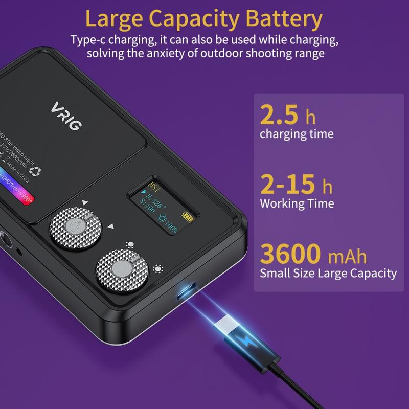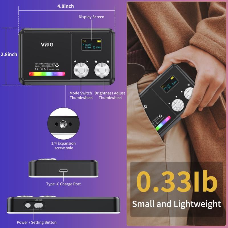El VRIG FD-98 ofrece calidad de iluminación profesional, control total de la temperatura del color, batería de larga duración y portabilidad en un dispositivo compacto. Es perfecto para los creadores que desean una iluminación fiable y de alta calidad sin tener que cargar con un equipo pesado. La combinación de CRI 95+, una pantalla OLED y controles continuos le ofrece una flexibilidad creativa que normalmente se encuentra en luces mucho más grandes.