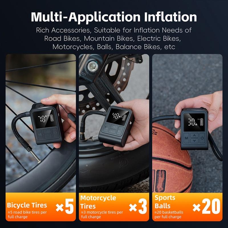 Este compresor de aire portátil WEST BIKING es ideal para los ciclistas que quieren un inflador fiable y fácil de transportar. Su función de preajuste permite un inflado desatendido, mientras que la pantalla digital garantiza una presión precisa en todo momento. Tanto si practica ciclismo, motociclismo o infla balones deportivos, esta bomba combina comodidad, potencia y precisión en un dispositivo compacto.