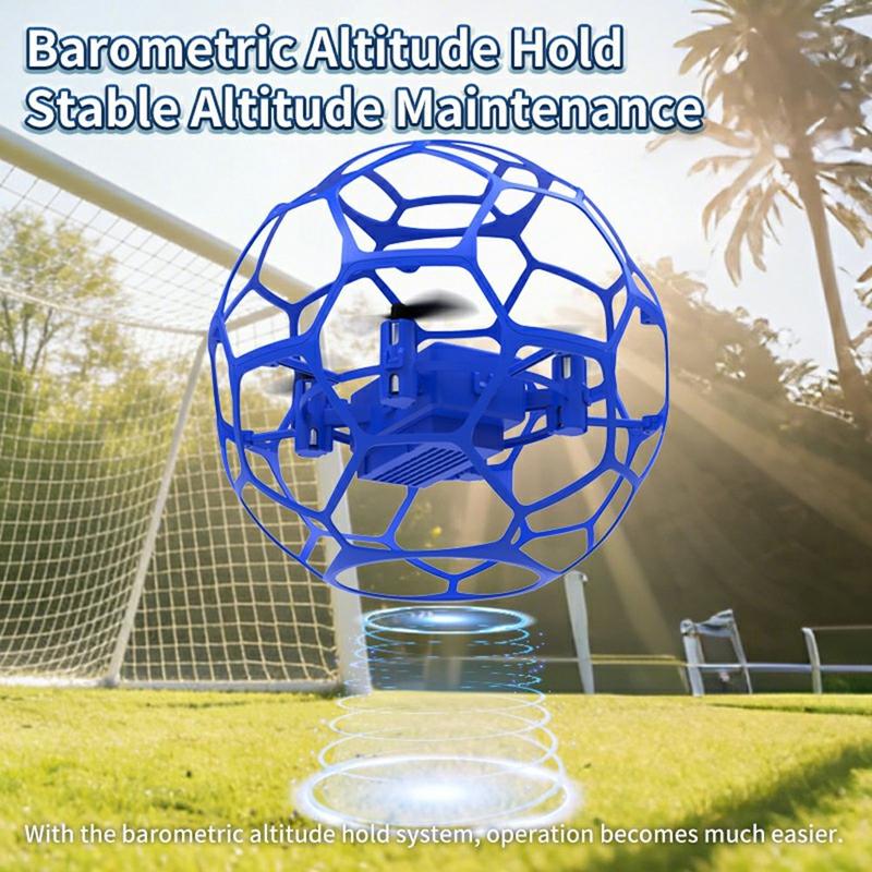 El dron XKJ K26 estilo balón de fútbol es un cuadricóptero balón volador ligero diseñado para jugar de forma segura y emocionante. Su estructura de red protectora esférica rodea las hélices, lo que ayuda a reducir el riesgo de colisiones y lo hace apto para niños y usuarios noveles de drones, tanto en interiores como en exteriores.